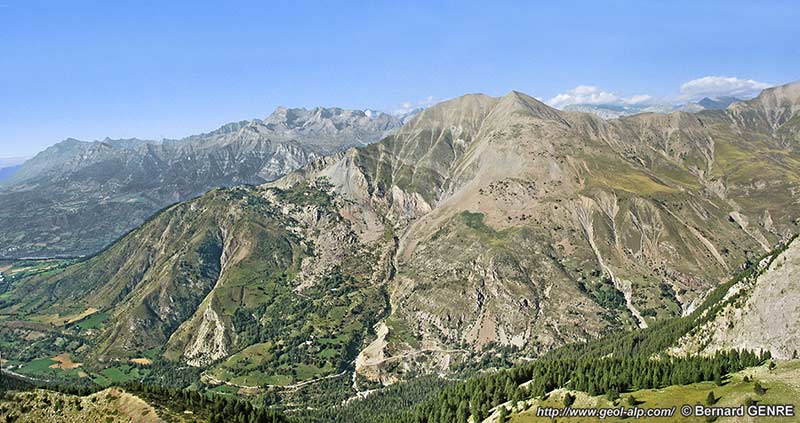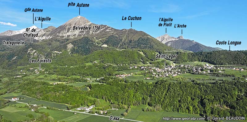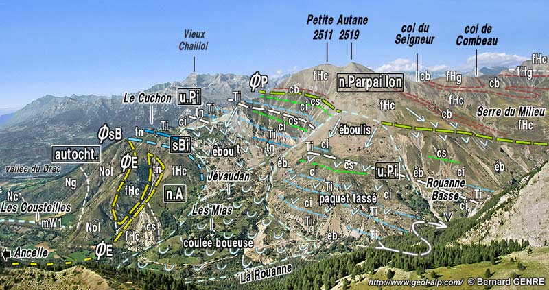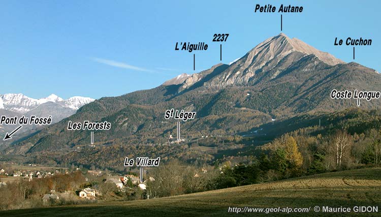 L'éperon occidental de la crête des Autanes, qui tombe sur le village d'Ancelle est celui qui montre de la façon la plus claire l'empilement d'unités tectoniques qui constitue cette montagne.