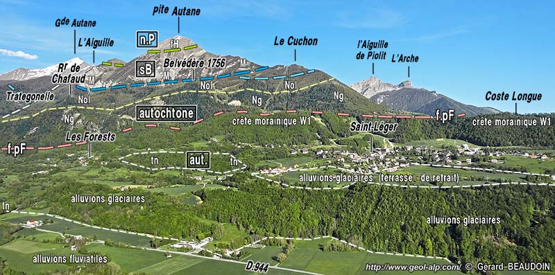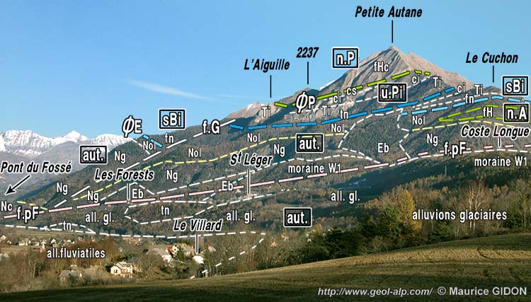 ![]() L'extrémité occidentale du chaînon des Autanes vue de l'ouest depuis le sommet du Puy de Manse (cliché original aimablement communiqué par Bernard Genre) n.P = nappe de flysch à Helminthoïdes du Parpaillon ; SB = écailles subbriançonnaises ; n.A = nappe de flysch à Helminthoïdes de l'Autapie ; ØE = surface de charriage basale des nappes de l'Embrunais ; f.pF = faille de Pont du Fossé. W1 = crête de la moraine du 1° stade de retrait de Würm. pour plus d'explications sur le quaternaire de la partie inférieure du cliché se reporter à la page "Ancelle" |