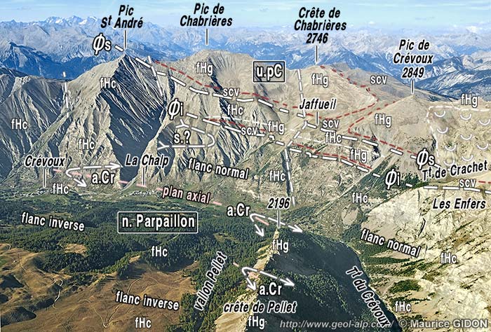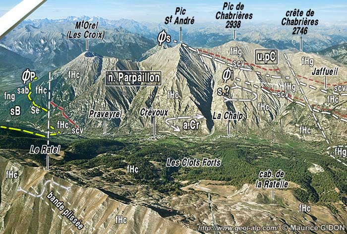 ![]() Le vallon de Crévoux, vu de l'W-NW depuis le Mont Guillaume (cliché original obligeamment communiqué par M. B. Genre) u.P = nappe du Parpaillon (fHc, fHg = flysch à Helminthoïdes, calcaire ou gréseux ; scv = schistes du col de Vars, de base de la succession) ; u.pC = unité du Pic Crévoux ; ØBr = surface de chevauchement de l'écaille briançonnaise de la Platrière ; SB = unités subbriançonnaises (sab = schistes à blocs ; fNg = grès de Pinfol ; fn = flysch noir ordinaire). ØE = surface basale de chevauchement des nappes de l'Embrunais : ØsS = surface de chevauchement de l'écaille de Saint-Sauveur, (Sé et Nc). f.M = faille du Méale (d'orientation presque N-S) : compartiment de droite soulevé et sans doute décalé vers le nord (= en sens dextre) (pour la structure du Méale voir la page "Les Orres"). |