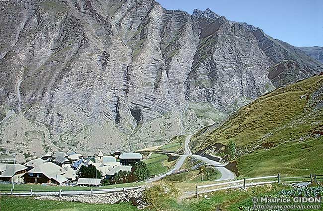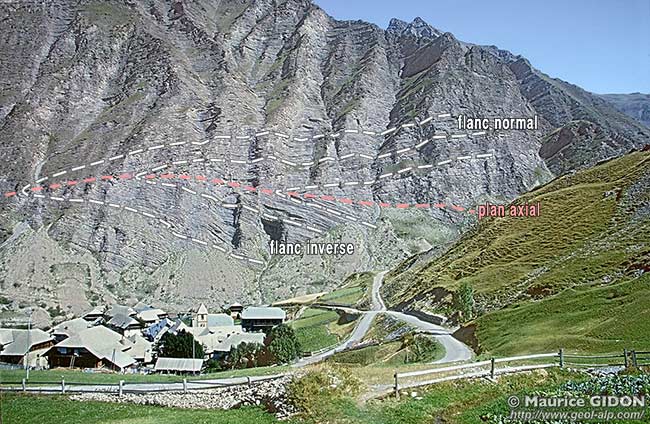 ![]() Le village de Crévoux, vu du sud Bel exemple de paroi formée de flysch à Helminthoïdes calcaire, montrant un pli couché qui est un anticlinal déversé vers l'ouest (vers la gauche). En fait ce pli est sans doute le prolongement, décalé vers le sud par décrochement, de l'anticlinal du Rabious de la rive droite de la Durance (voir la page "Vautisse"). |