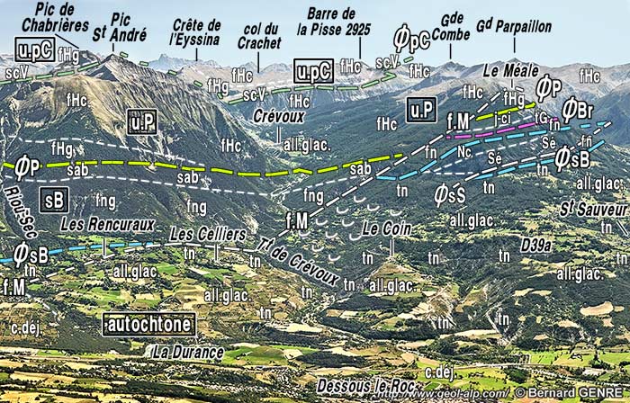 À l'est de Crévoux les pentes les plus hautes de cette rive droite montrent que la succession des couches du flysch à Helminthoïdes est redoublée à deux reprises par l'effet d'un chevauchement annexe, celui dit "du Pic Crévoux" (d'après le nom donné sur les anciennes cartes - y compris sur le 1/50.000°géologique - à la crête de l'Eyssina) ; mais le fond de vallée, qui remonte vers le sud en direction des crêtes sommitales du Parpaillon reste en contrebas de cette surface tectonique, au sein du corps de la nappe du Parpaillon.