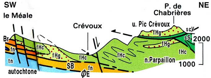 coupe SW-NE, transversale à la vallée de Crévoux (extrait retouché de la carte Embrun 2° éd.) Br = écaille de matériel briançonnais ; SB = écaille de matériel subbriançonnais ; ØE = surface de chevauchement des nappes de l'Embrunais ; s.cV = schistes noirs et pourpres du col de Vars (formation basale du flysch à Helminthoïdes) ; f.Hg = flysch à Helminthoïdes inférieur, gréseux ; f.Hc = flysch à Helminthoïdes calcaire (masse principale). |