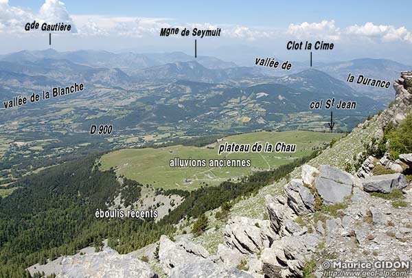 Du côté ouest de la crête la barre tithonique qui affleure à Saint-Vincent les Forts se poursuit au pied des escarpements de Dormillouse mais elle est en grande partie masquée sous une importante jupe d'éboulis plus ou moins récents (sans doute würmiens) stabilisés par le couvert végétal. En outre ce versant se singularise par la présence du Plateau de la Chau, sur lequel repose une bonne partie des installations de mi-pente de la petite station de ski de Saint-Jean-Montclar. Il émerge en quelque sorte de ces éboulis et s'en distingue par sa pente, inclinée vers la vallée de la Blanche mais beaucoup plus douce et ceinturée d'un escarpement garni d'éboulis frais.