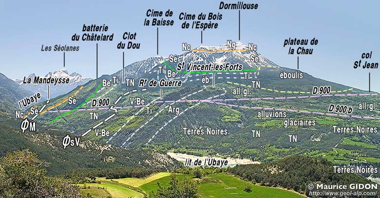 ![]() La rive gauche de l'Ubaye à la hauteur de Saint-Vincent les Forts, vue du nord-est, depuis les pentes du col de Pontis. ØM = chevauchement de La Mandeysse (voir la page "Le Lauzet") ; ØsV = chevauchement de Saint-Vincent les Forts. Les tirets roses soulignent le tracé des deux routes principales qui donnent accès à la vallée de l'Ubaye sur cette rive. |