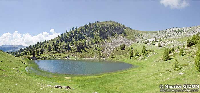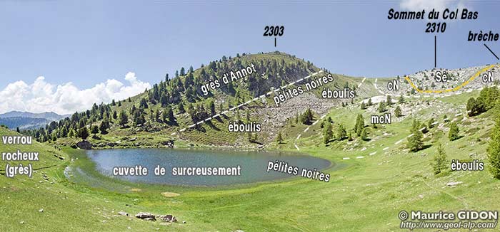 ![]() Le Lac Noir de Dormillouse, vu du nord cN = calcaires à Nummulites ; mcN = marno-calcaires à globigérines |