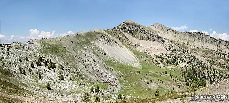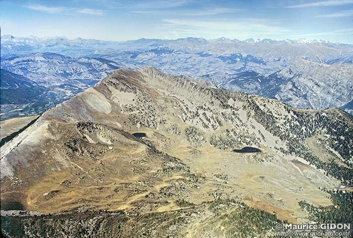 À l'extrémité orientale de cette crête ces couches autochtones sont chevauchées par une dalle de calcaires du Jurassique moyen qui dessine un chevron saillant vers l'ouest et qui culmine au sommet du Peyron (voir la page "Laverq"). Elle appartient aux nappes de l'Embrunais-Ubaye et plus précisément à l'unité la plus basse de cet ensemble sur cette transversale, celle des Trois Évéchés (laquelle se rattache à la zone subbriançonnaise).