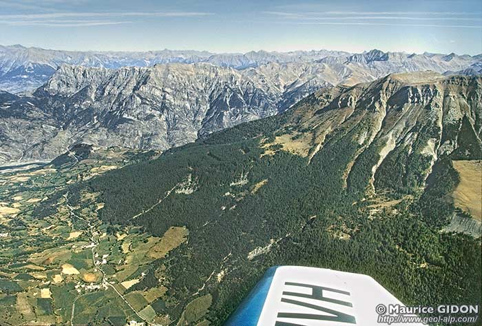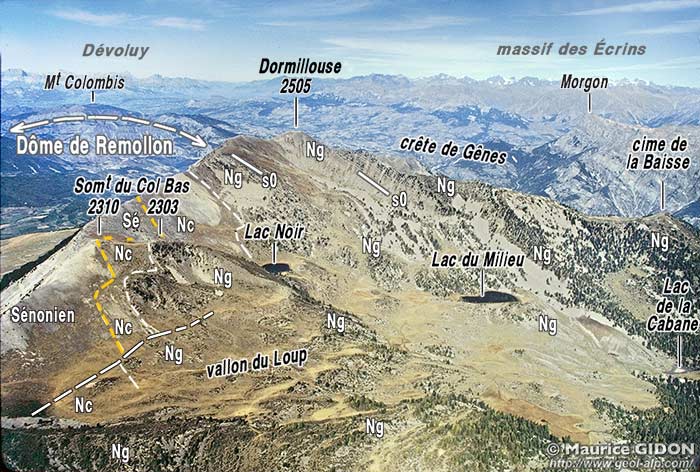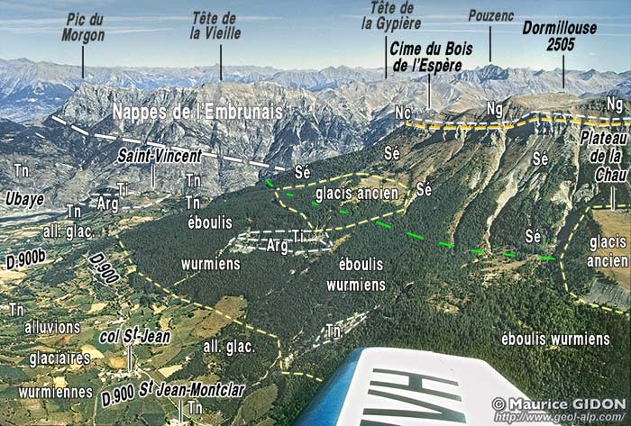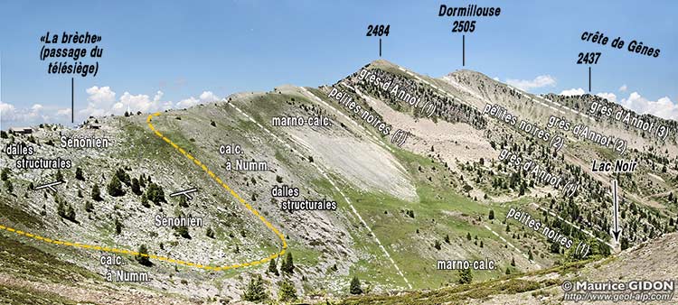 Du côté nord les abrupts du sommet de Dormillouse, qui dominent le village de Saint-Vincent les Forts montrent très distinctement le litage, presque parallèle à ligne de crête, des couches qui constituent le couronnement de la montagne : il s'agit des couches inférieures des dépôts d'âge nummulitique (calcaires de base et premiers bancs de grès "d'Annot"), qui reposent ici sur les calcaires blancs du Sénonien, lesquels forment l'essentiel des abrupts, sur plus de 200 m de dénivelée.
