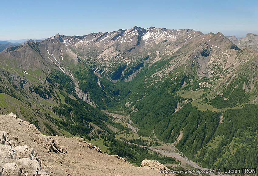 La haute vallée du Laverq est fermée du côté sud par l'arête orientale de la Tête de l'Estrop (2961), qui se trouve au pointculminant de la ligne de partage des eaux entre les bassins de l'Ubaye (vallée du Laverq) d'une part, et du Verdon d'autre part. A l'ouest de ce sommet cette crête s'oriente au contraire vers le nord-ouest en se raccordant au chaînon de La Blanche qui constitue le versant occidental du Laverq et le sépare des bassins de la Bléone et du Bès. Toutes ces crêtes sont formées par la partie la plus élevée, nummulitique, de la succession stratigraphique autochtone qui disparaît à l'est du Laverq sous les nappes de l'Embrunais (voir la page "Séolanes").