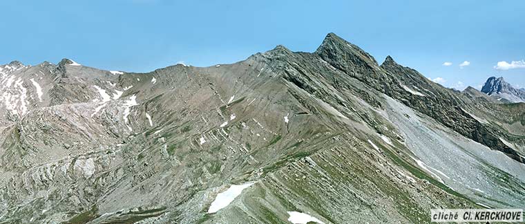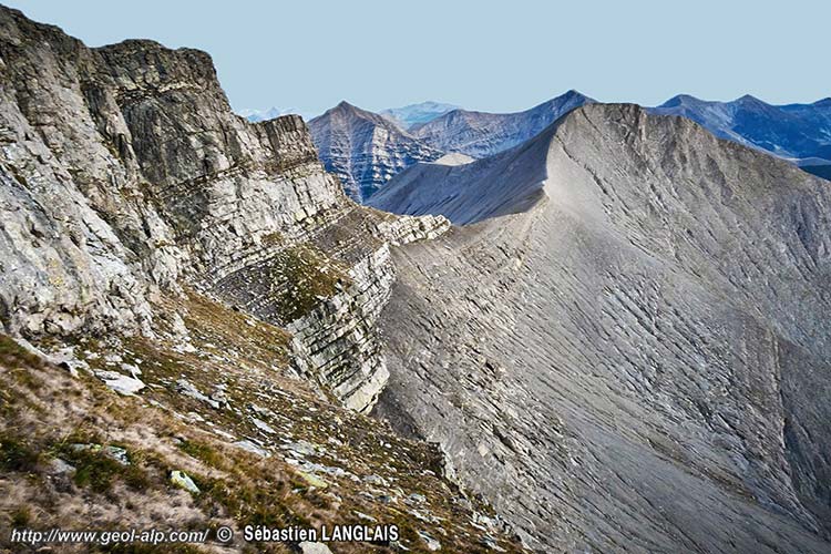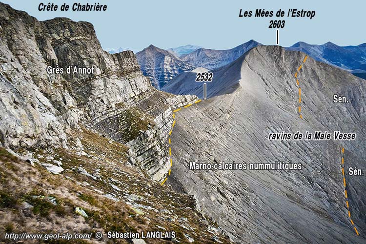 Par contre au nord de l'Estrop (plus précisément à partir du Puy de la Sèche) ces couches n'affleurent plus qu'en contrebas de la crête principale du chaînon de la Blanche et forment, au nord de ce point, le crêt* typique de la Tête de Chabrière (2759 m), à regard ouest, qui court jusqu'au Pic de l'Aupillon en séparant le vallon principal de celui affluent du torrent du col de Pierre. Ce sont alors les couches de leur soubassement stratigraphique, essentiellement constituée par les calcaires blancs très lités du Sénonien, qui arment cette crête, de la Roche Close au sommet de L'Aiguillette (voir la page "Laverq").