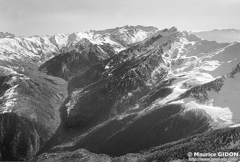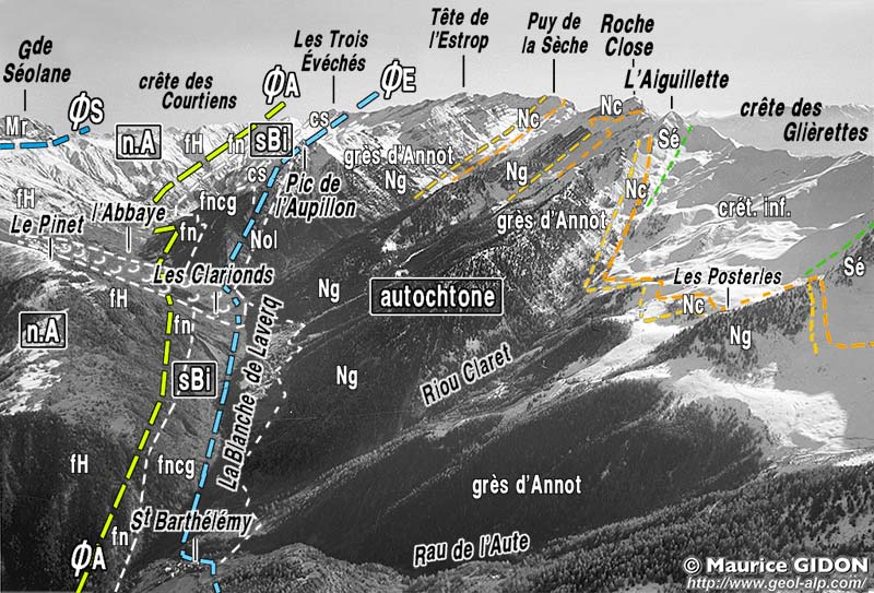 ![]() Le vallon des sources de La Blanche, vu depuis la Petite Séolane (cliché original obligeamment communiqué par M. Lucien Tron). n.A = nappe de l'Autapie (ØA = sa surface de chevauchement) ; sBi = nappe subbriançonnaise inférieure ("écaille des Trois-Évéchés", à laquelle se rattachent les brèches nummulitiques "fncg" du Pic de l'Aupillon) ; ØE = chevauchement basal des nappes de l'Embrunais. Nol = formation olistolitique de la fin de la sédimentation nummulitique. Les petits schémas représentent la disposition des couches que l'érosion a dégagées en "dalles structurales". Ce cliché fait partie d'un panorama dont on trouvera la suite du côté droit (3 clichés complémentaires) à la page"Laverq"). |