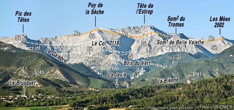 ![]() Le versant occidental de la Tête de l'Estrop, vu du SW depuis la vallée inférieure de la Bléone (environs de Marcoux) (cliché original obligeamment communiqué par M. H. Widmer). N.B. : Le sommet de l'Estrop est en réalité masqué par son antécime sud-occidentale, la Crête de Chabrière, 2888). Noter le contraste entre la planéité de l'interface Crétacé - Nummulitique (en jaune), qui pend vers l'arrière-plan, et les replis couchés qui affectent au contraire la surface basale des calcaires du Crétacé supérieur ("Sé"), d'âge Turonien à Santonien. La perspective, trop fuyante ne permet pas d'analyser les replis du Crétacé inférieur - moyen, ni, a fortiori, ceux du Tithonique qui affectent les bas versants (voir la page "Prads"). |