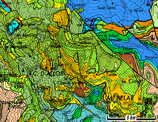 En outre les couches de cette unité se montrent ployées en un pli couché, l'anticlinal du Clots des Morts, de sorte que la grosse masse calcaire du Pain de Sucre se trouve disposée à l'envers (de la même façon que la succession, de même constitution, qui forme la Grande Séolane).