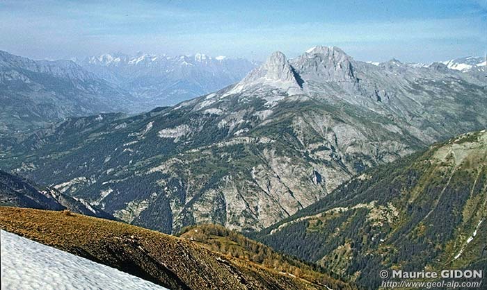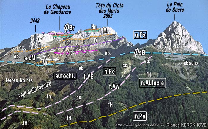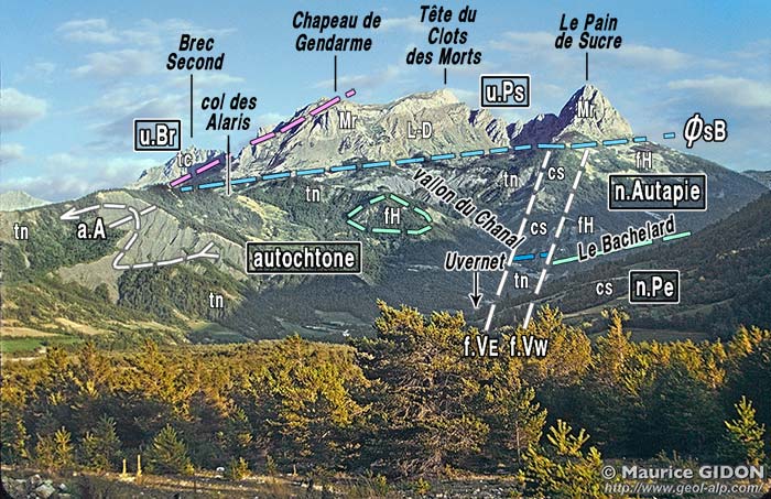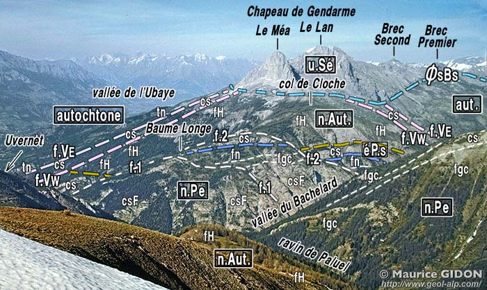 ![]() Le groupe montagneux du Chapeau de Gendarme, vu du SW, depuis le col d'Allos. u.Sé = digitation subbriançonnaise des Séolanes ; ØsB = surface de chevauchement des écailles constituant la semelle de la nappe du Parpaillon ; f.VE, f.VW = failles du Verger ; n.Pe = nappe subbriançonnaise du Pelat ; éP.s = écailles supérieures de la nappe du Pelat (surface de chevauchement en bleu sombre) ; n.Aut. = nappe de l'Autapie ; f.1, f.2 = failles sub-verticales (décrochements ?), presque N-S, à lèvre orientale abaissée (parallèles à celles du Verger, elles se prolongent en rive gauche du Bachelard par la faille du ravin de la Tellière). N.B. : concernant les failles du Verger on trouvera des commentaires à la page "Basse Ubaye". |