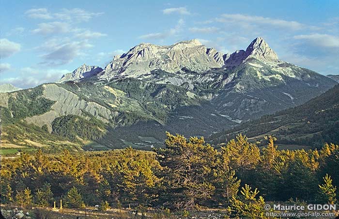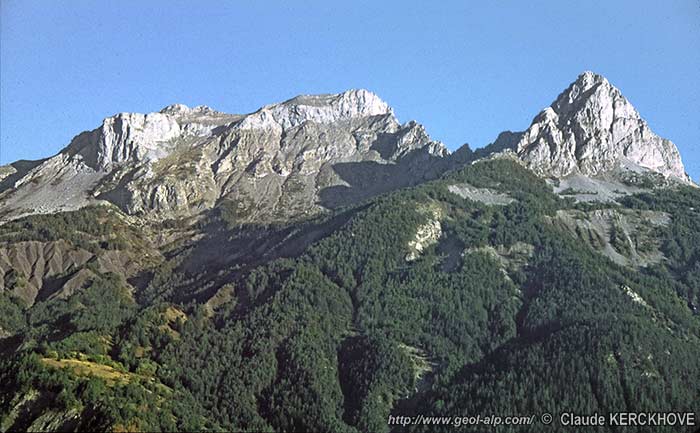 Vue de Barcelonnette leur crête rocheuse se fait remarquer par son profil tricorne qui lui vaut le nom, désormais plus usité, de Chapeau de Gendarme. Cette partie rocheuse sommitale de la montagne est effectivement formée par un chapeau de roches calcaires qui est posé sur des pentes à relief plus mou et plus boisé, constituées de Terres Noires, de son soubassement. Il s'agit d'une klippe*, formée d'un empilement de deux unités, l'une, inférieure, de caractère subbriançonnais, l'autre, supérieure et constituant essentiellement les rochers des Brecs, de caractère briançonnais car surtout constituée de calcaires et dolomies triasiques.