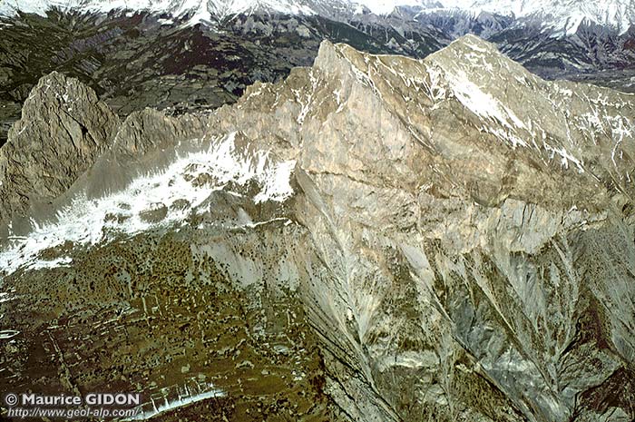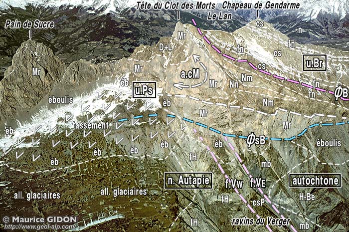 ![]() Le Chapeau de Gendarme (versant sud), vu du sud d'avion, depuis l'aplomb du col du Talon. u.Br = unité des Brecs ; u.Ps = unité du Pain de Sucre, rattachable à celle des Séolanes : "Mr" = Malm récifal (calcaires massifs) ; "Nn" = grès calcaires à grandes nummulites (Lutétien) ; "Nm" = calcschistes à globigérines (Priabonien). a.cM = anticlinal du Clots des Morts, couché vers le sud-est (vers la droite) ; f.Vw , f.VE = failles du Verger. Couches autochtones : "mb" = marnes "bleues" apto-albiennes ; "H-Be" = calcaires argileux néocomiens (Hauterivien-Berriasien) ; "csP" = calcschistes néocrétacés de la nappe du Pelat. N.B. : concernant les failles du Verger on trouvera des commentaires à la page "Basse Ubaye". |