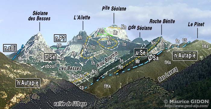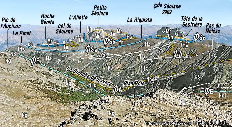 ![]() La rive orientale du haut vallon du Laverq, vue du S-SW depuis crête orientale de la Tête de l'Estrop (cliché original obligeamment communiqué par M. A.Dufour). ØE = surface basale de charriage des nappes de l'Embrunais (base de l'écaille des Trois-Évéchés ; ØA = surface basale de la nappe de l'Autapie ; ØSa = surface basale du chevauchement de l'unité des Séolanes ; ØSb = surface de chevauchement de la Petite Séolane ; ØSc = surface de chevauchement de la Grande Séolane ; tirets blancs gras = imbrications secondaires (parautochtones). |