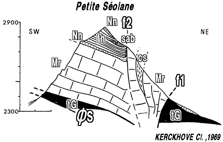 Coupe transversale à la crête de la Petite Séolane d'après Cl. Kerckhove, 1969. ØS = surface de chevauchement de l'unité des Séolanes ; f1 = faille orientale (prolongement méridional de l'accident de Méolans ?) ; f2 = faille NW-SE, longitudinale par rapport à au synclinal de l'Ailette. |