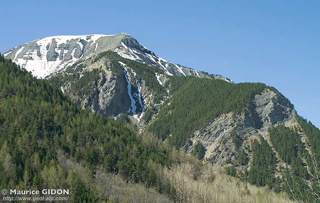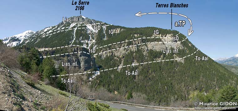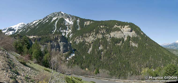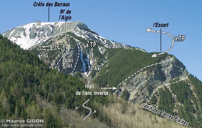 ![]() Le débouché du vallon des Terres Plaines ("Porte de l'Enfer"), vu du N-NE, depuis la route de Restefond (D.64), 500 m en amont du hameau de la Chalancette Le Bec de l'Aigle est formé par les calcaires liasiques (Lias inf.) qui dessinent la charnière de l'anticlinal des Terres Plaines (on la voit d'ici presque dans l'axe du pli), tandis qu'au niveau du Bajocien cette charnière est crevée par l'érosion. On a attiré l'attention sur un repli du Bajocien : il est typique d'un flanc inverse de pli, par le sens du cisaillement affectant les couches qu'implique la disposition de ses flancs courts - flancs longs (voir le schéma des plis parasites). |