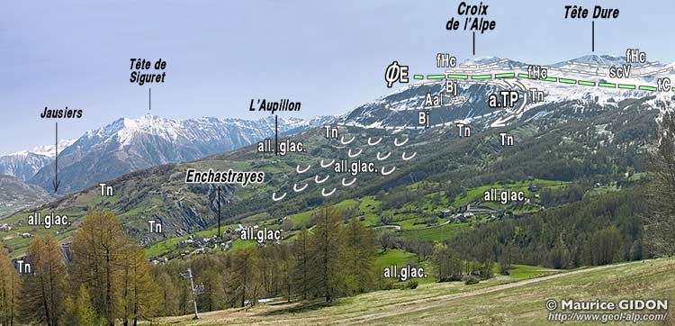Plus au sud-ouest ce sont les couches du Bajocien de la charnière du pli qui affleurent dans le versant ouest de la Croix de l'Alpe, avant de disparaître, à l'ouest de la Tête Dure d'Enchastrayes, sous les Terres Noires qui enveloppent cette tête anticlinale.