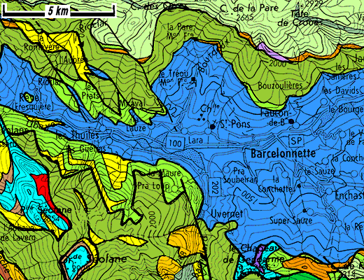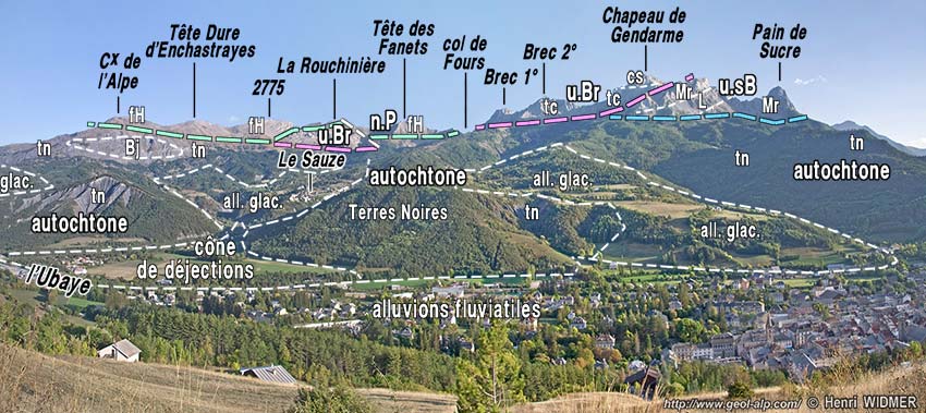 Cette partie de la vallée de l'Ubaye est dans une situation très comparable à celle de la région d'Embrun vis à vis de la Durance. Là encore l'érosion de la rivière a percé la chape des nappes de l'Embrunais, en mettant à nu leur substratum autochtone à la faveur d'un bombement anticlinal. Mais, à la différence de ce qui se passe dans la dépression d'Embrun, dans celle de Barcelonnette l'aire d'affleurement de l'autochtone se referme vers l'aval et constitue donc une fenêtre véritable.