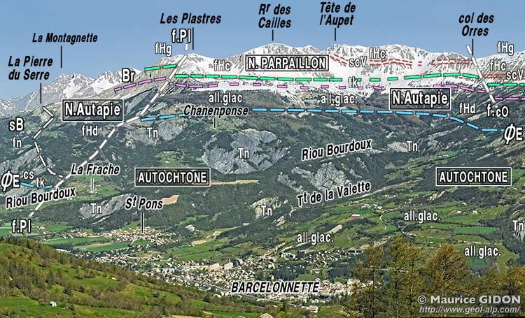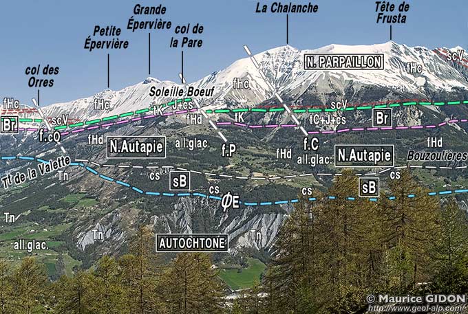 Quant à la semelle de terrains briançonnais qui supporte la nappe du Parpaillon, elle est constituée par des lames relativement minces (d'épaisseur pluri-décamétrique) de calcaires triasiques et jurassiques, ainsi que de calcschistes néocrétacés ; elles sont assez peu continues et imbriquées en désordre et il s'y intrique localement des passées de cargneules et de gypses triasiques. Elles n'affleurent en fait, toujours au pied des escarpements de flysch à Helminthoïdes, que lorsqu'elles ne sont masquées ni par le sommet des alluvions glaciaires, qui culminent en une ligne de replats vers l'altitude de 2200 m, ni par la jupe d'éboulis dont la partie basse s'appuie le plus souvent sur ces dernières en les recouvrant.