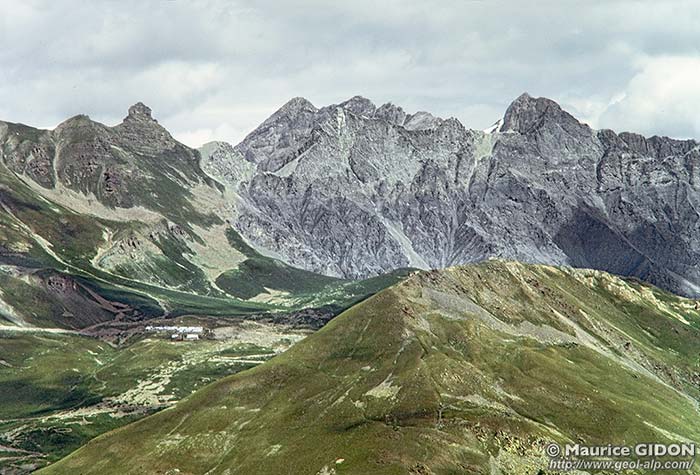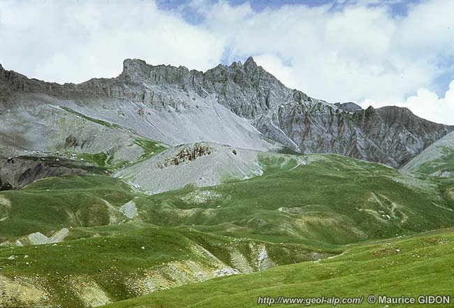 La longue arête rocheuse qui court depuis la Crête de La Tour (Cime de Pelousette, Bonnet Carré), à l'ouest, jusqu'au Pas de la Cavale et au col de Pourriac, à l'est, correspond à la ligne de partage des eaux entre Ubaye et Tinée. C'est un crêt*, presque entièrement constitué par la succession stratigraphique autochtone de la couverture sédimentaire du massif cristallin de l'Argentera.