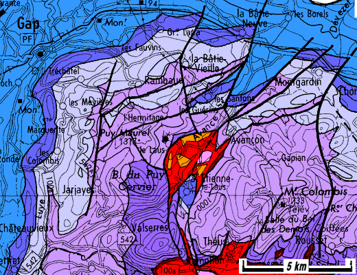 La partie occidentale du Dôme de Remollon, à l'ouest de cette localité et de la vallée de l'Avance, est caractérisée par le fait que les couches du Lias et du Dogger affectent, au sud-est de Gap, une disposition périclinale*, en plongeant de façon rayonnante, autour d'un noyau surélevé de Lias calcaire qui culmine au Puy Cervier. |