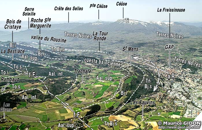 Tn Bj.s = niveaux inférieurs des Terres Noires, d'âge Bajocien supérieur ; Bj.i = cuesta des calcaires argileux lités du Bajocien inférieur ; Aal. sup. = combe des marnes de l'Aalénien supérieur.