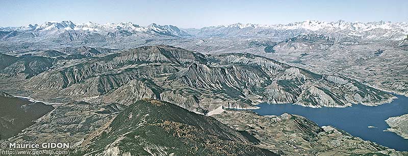 Le dôme de Remollon et la retenue de Serre Ponçon vus du sud, d'avion, depuis l'aplomb des abords ouest de Saint-Jean - Montclar.