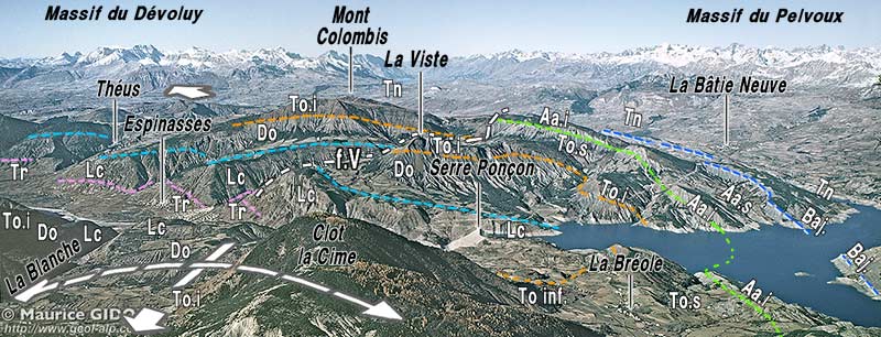 Les grosses flèches indiquent le plongement de la voûte de l'anticlinald'Espinasses vers le NW (sous le Dévoluy occidental) comme vers le SE.