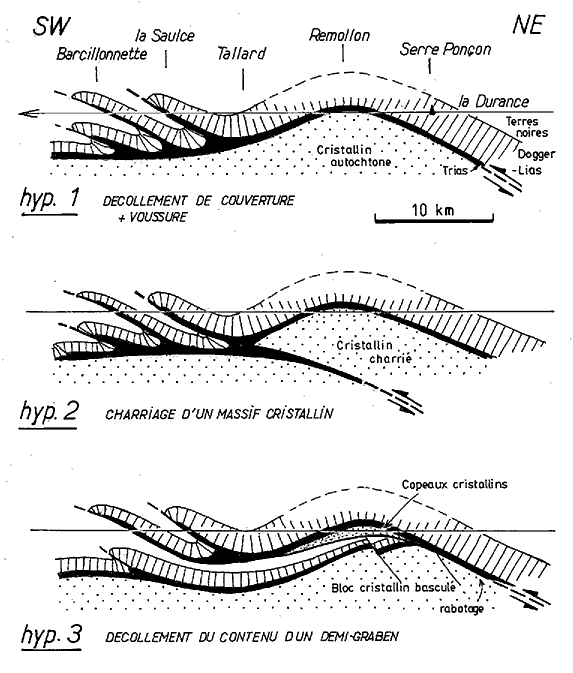 En raison de la présence d'affleurements de socle cristallin au coeur du Dôme de Remollon (à Remollon même et à Chaussetive), on a longtemps considéré qu'il s'agissait d'un bombement autochtone, comparable, en moins saillant, aux massifs du Pelvoux et de l'Argentera-Mercantour. Diverses considérations (cf publication n° 068) portent à penser, au contraire, que ce bombement fait partie d'un ensemble charrié, celui de la nappe de Digne. Dans cette perspective, diverses hypothèses peuvent être envisagées en ce qui concerne la structure profonde du Dôme et ses rapports avec les secteurs plus occidentaux.