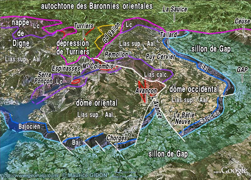 En fait le dôme de Remollon est constitué de deux parties, séparées par une ligne de dislocation, majeure mais complexe, l'accident de l'Avance, qui est constitué par un faisceau de failles dont les plus importantes sont la faille de la Bâtie Neuve et celle de Remollon (cf. la vue d'ensemble ci-dessus).