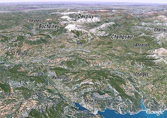 - la dépression de Laragne, qui s'intercale, au sud des chaînons les plus méridionaux du Bochaine entre les cours N-S du Buëch à l'ouest et de la Durance à l'est. Il n'y affleure pratiquement que des Terres Noires (d'ailleurs largement recouvertes de dépôts quaternaires) qui y sont principalement affectées par une structure anticlinoriale (ce qui correspond à une franche inversion du relief).