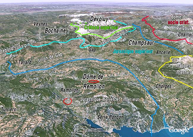Le trait bleu fonçé correspond à la corniche du Bajocien, qui forme la limite externe du Dôme de Remollon
