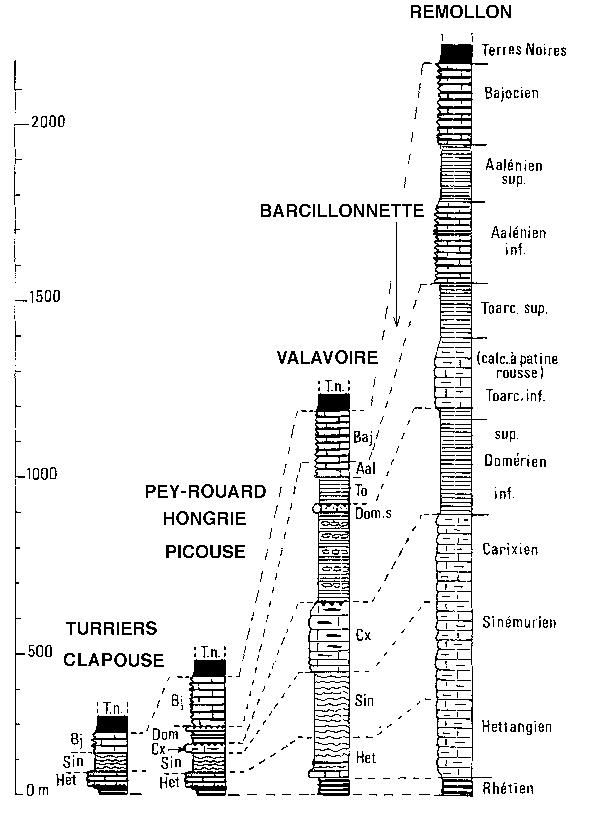 · Au Lias-Dogger, lors de l'expansion océanique alpine, les chaînons au NE de Sisteron appartiennent à la marge occidentale du domaine dauphinois (que caractérise un Lias argilo-calcaire très épais). La transition aux faciès néritiques et lacuneux de la dorsale plus occidentale, qui remonte de la Provence en direction du nord, s'y manifeste par une réduction très progressive de l'épaisseur de cette succession. On l'observe d'est en ouest, à la latitude de Digne, dans les parties les plus externes de la nappe et, plus au nord, dans les écailles de son avant-pays. Cette réduction est encore plus accentuée dans l'autochtone des environs de Barles et surtout de Turriers, où elle est telle qu'en certains points, le Bajocien, souvent amputé de ses couches inférieures repose directement sur l'Hettangien ou même sur le Trias.