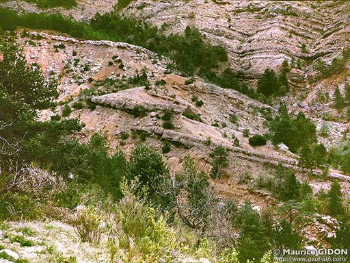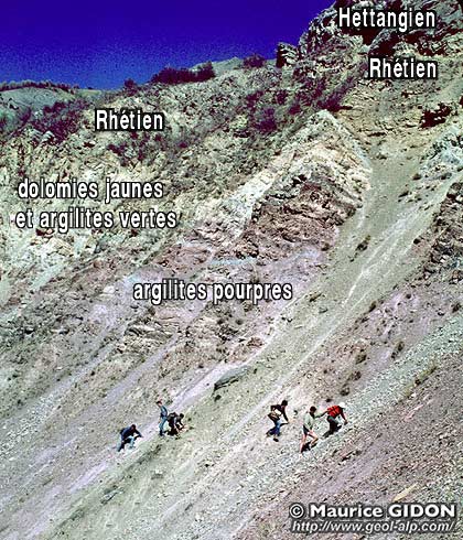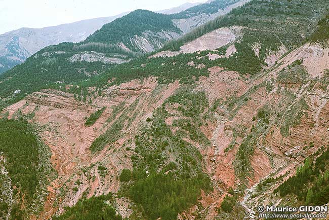 Le Trias, à la base de la nappe de Digne sommet des ravins de Rousset, au nord de la crête de Beilet (vue prise en direction du nord-est).(une petite faille extensive, de rejet décamétrique, décale la limite Rhétien-Keuper). |