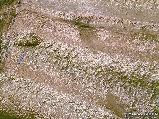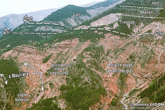 Noter l'épaississement de la succession des molasses rouges lorsque l'on s'écarte, vers le sud, de la voûte de l'anticlinal de la Maurière :elle se fait par de multiples petites discordances internes, ce qui indique que le bombement de la voûte s'accroissait pendant la sédimentation molassique.