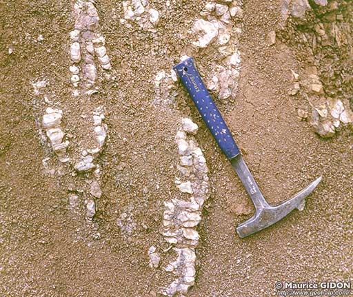 (concrétions calcaires formées autour de racines pivotantes de plantes avant poussé sur la couche de limon maintenant lithifié)