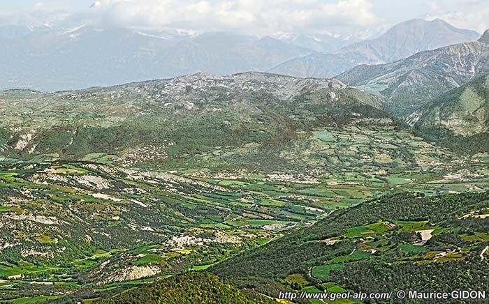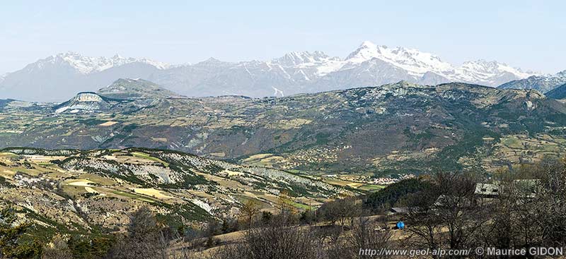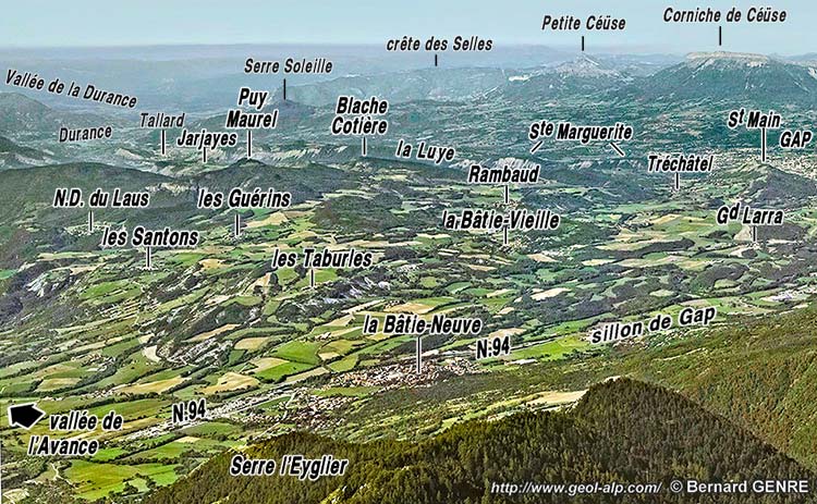 Sur cette transversale, les pentes septentrionales du sillon de Gap ne sont pas couronnées par la barre tithonique comme elles le sont plus à l'ouest, aux abords du col de Manse : ici la crête qui sépare le sillon de Gap de la cuvette d'Ancelle est formée par des grès nummulitiques qui reposent en transgression* sur les Terres Noires, par l'intermédiaire de leurs habituels calcaires de base.