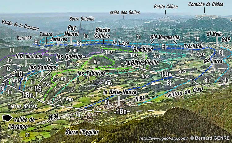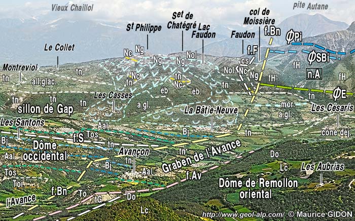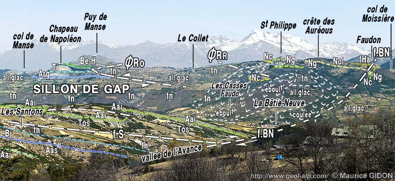 L'interruption de la cuesta bajocienne à cet endroit est due au passage d'une cassure majeure, orientée presque N-S et à pendage presque vertical. Cette faille de La Bâtie-Neuve limite du côté ouest le fossé d'effondrement de l'Avance où les Terres Noires affleurent en dessinant sur la carte un golfe s'avançant vers le sud.