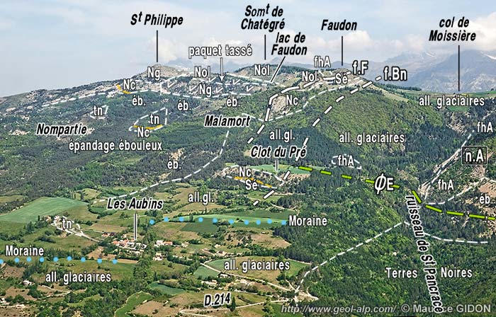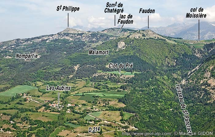 La crevasse d'arrachement du sommet de ce tassement dessine, comme d'habitude en pareil cas, un vallonnement en forme de croissant de lune, parallèle à la crête : C'est dans le creux même de cette crevasse que se trouve logé le petit lac de Faudon. A mi-hauteur du versant éboulé on voit émerger quelques pointement de calcaires nummulitiques que l'on pourrait croire tassés ; toutefois leur alignement et la présence d'une charnière synclinale qui affecte le plus occidental d'entre eux suggère qu'ils jalonnent le petit chevauchement du Rocher La Rouine qui est observable sur le versant opposé de la crête (voir la page "Ancelle") |