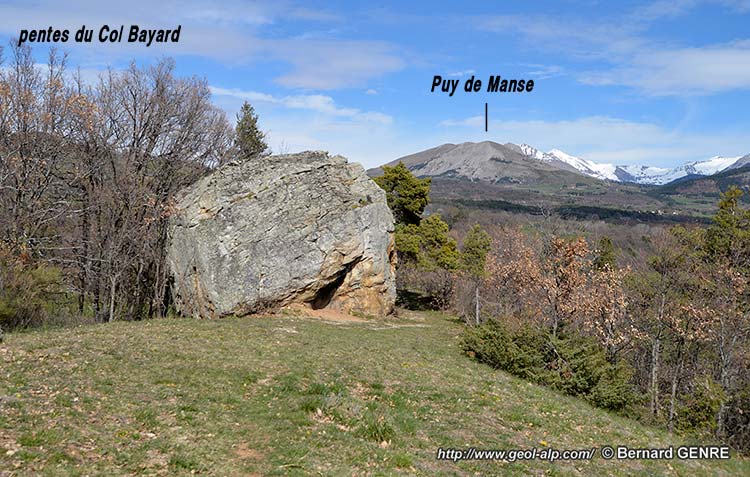 Le col Bayard se situe à la marge ouest d'un seuil, large de plus de 5 km, qui forme la limite entre le Champsaur au nord et le sillon de Gap au sud et qui les met à tous points de vue en communication l'un avec l'autre. Du point de vue structural ce seuil correspond à une large voussure anticlinale (coupe schématique en fin de page) qui prolonge vers le NW le gros bombement du "Dôme de Remollon" : ce dernier affecte ici des couches plus élevées dans la succession stratigraphique, savoir celles de la limite Jurassique - Crétacé. Il est limité à l'ouest comme à l'est par une bordure relativement escarpée que déterminent les formations calcaires de la corniche tithonique, lesquelles correspondent aux deux flancs de cet anticlinal.