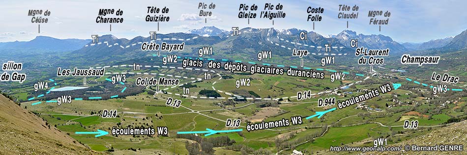 Le versant nord du col (voir la page "Saint-Bonnet") descend d'abord, jusqu'à Laye, par une longue pente douce vers la vallée du Drac : il s'agit d'un glacis raboté, au cours du dernier stade (W2) de la diffluence, par la langue glaciaire qui s'écoulait en direction du Drac ; elle l'a encore garni d'un enduit de matériel morainique lors du retrait avant la crue du stade W3.