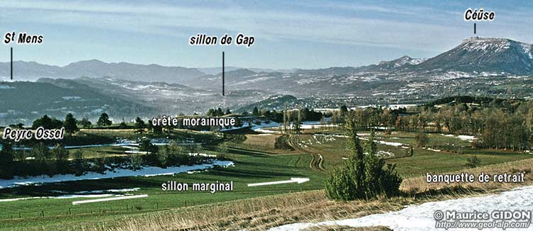 ![]() La crête morainique de Peyre Ossel (stade 5), à flanc de pentes entre Gap et le col Bayard. vu depuis les pentes en contrebas de la N544, 1,5 km à l'est de Puymonbeau (voir localisation sur le cliché précédent) La banquette de retrait d'où est prise la photo correspond à la dernière oscillation du retrait glaciaire qui a suivi le stade 4. Cet exemple est très représentatif des formes de relief abandonnées aux flancs des vallées alpines par les langues glaciaires qui les ont empruntées. |