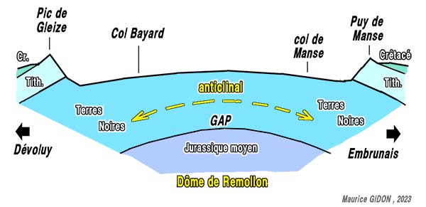 Coupe W-E, très schématique, du seuil du Col Bayard. |