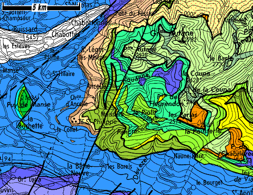 Cette différence tient sans doute au fait qu'ici, comme en rive est du Champsaur, la chape protectrice constituée par les calcaires sénoniens du Dévoluy, a été enlevée par l'érosion qui a précédé la transgression des calcaires à Nummulites. De plus cette érosion a affouillé de plus en plus profondément en direction de l'est, de sorte que, dès le revers est du Chapeau de Napoléon il n'existe plus le moindre affleurement de Crétacé inférieur ni même de Tithonique : immédiatement au sud d'Ancelle, les calcaires à Nummulites des Tours Saint-Philippe reposent directement sur les Terres Noires.