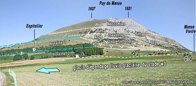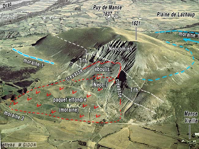 ![]() Le Puy de Manse vu du sud-ouest, d'avion depuis l'aplomb du col de Manse On voit qu'à droite du Puy de Manse le glacier durancien envoyait une courte langue diffluente secondaire qui s'avançait vers la dépression de la plaine de Lachaup (voir page "Ancelle"), mais sans l'atteindre. |