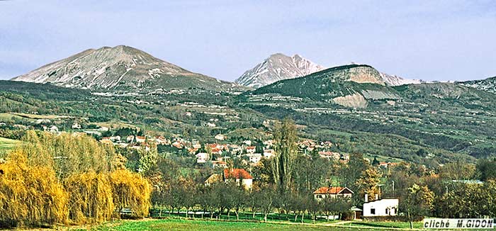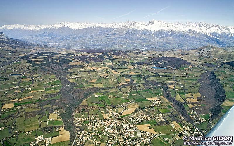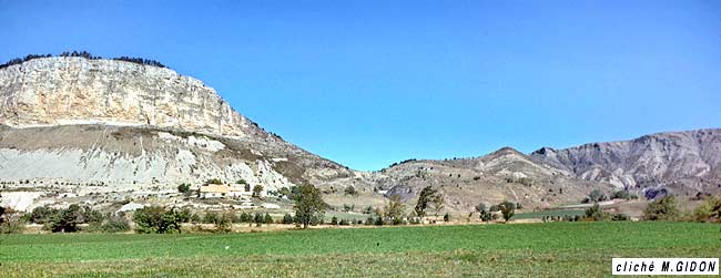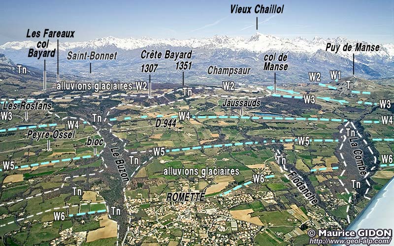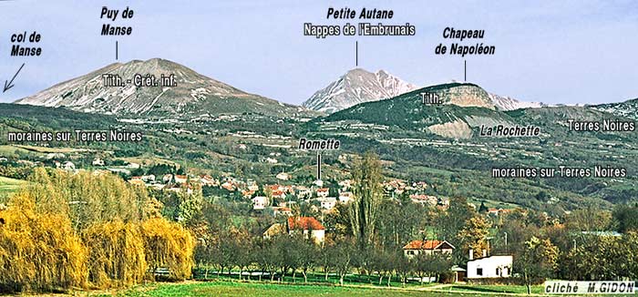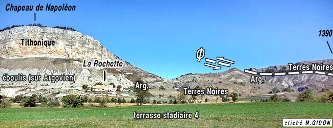 ![]() Le site de La Rochette vu du sud, depuis la route de Romette La partie supérieure du rebord septentrional du sillon de Gap domine, au sud-est du col de Manse, un escalier de terrasses. Chacune est constituée par des alluvions fluviatiles déposées en marge externe de la moraine de l'un des stades successifs du retrait du glacier würmien qui empruntait le sillon de Gap. La barre tithonique disparaît vers le sud-est parce qu'elle est sectionnée par une surface de chevauchement (Ø = chevauchement de La Rochette) qui se poursuit vers le nord en passant au pied oriental du Puy de Manse (en arrière sur ce cliché). C'est là le premier témoin des écaillages* qui affectent l'autochtone aux approches de l'Embrunais, secteur où l'arrivée des nappes internes a provoqué, sous elles, des imbrications multiples. |