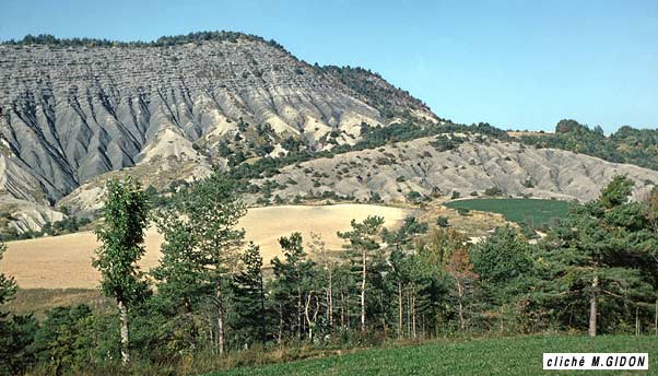 A l'est de Gap le sillon où s'est implantée cette ville se poursuit vers l'est, dominé au nord par des pentes où les Terres Noires sont largement couvertes par les moraines de l'ancien glacier de la Durance mais où de puissants ravins les mettent cependant à nu.
