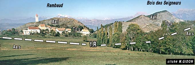 ![]() Le village de Rambaud vu du sud, depuis la combe déterminée par la faille de Rambaud. La cuesta de l'Aalénien inférieur, qui porte le clocher, se poursuit vers la droite en direction de La-Bâtie-Vieille. Le décalage que l'on croit voir sous cet angle n'est qu'un effet de perspective, dû au thalweg qui la traverse à l'est du village. Les prairies d'avant plan sont installées à cheval sur les marnes du Toarcien supérieur et sur de l'Aalénien supérieur, abaissées par la faille au revers nord-ouest de la cuesta de Bois Vescal. En arrière-plan, derrière le sillon de Gap, les massifs du Vieux Chaillol et de Piolit. |